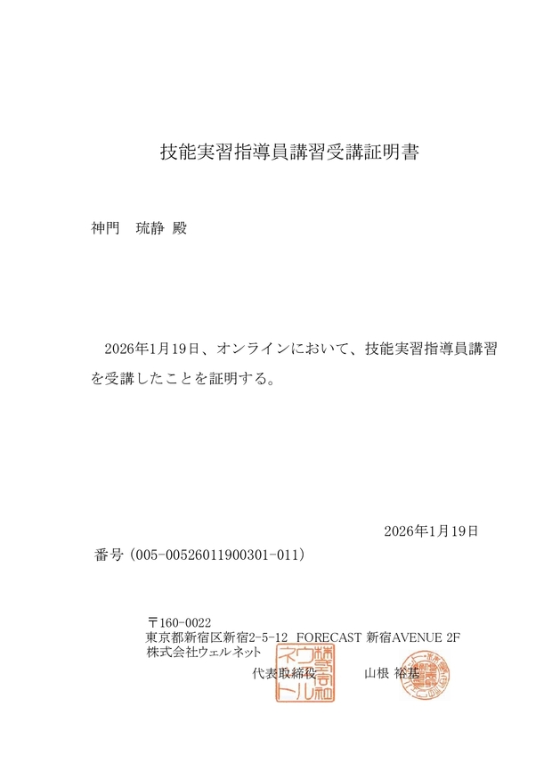 1月19日に弊社社員の神門君が技能実習指導員講習を受講しました。技能実習指導員は、技能実習生に対し実習計画に基づいた指導を行い、安全且つ適切に技術を習得できるよう支援する重要な役割を担っています。本講習では、技能実習制度の理解、指導方法、安全衛生管理など、実習生を育成するために必要な知識を学びました。
